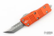 This Troodon Mini Hellhound OTF automatic by Microtech knives features a stonewash finished single edged blade, and a orange aluminum handle with bead blasted hardware, tip down carry. Glass breaker. S/N 432. Dated 01/2023. Comes with original box and papers. Excellent condition.