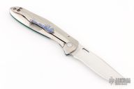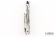 This custom framelock by Matt Cucchiara features a hand rub satin finished clip point blade with a notched thumbrest and a thumbhole. The handle has a carved and anodized titanium frame with matching tip up clip. Nice detent, lockup and blade seating. Cucchiara is engraved on the inside of the frame. Has some scratches, otherwise good condition. Comes with a zippered case.