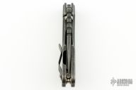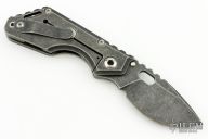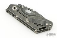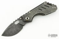 This Mick Strider custom Stub XL tanto features a distressed blade with notched thumb ramp and swedge. The handle is distressed finished titanium frame with a pocket clip that has a matching finish and is positioned for tip up carry. Blade is centered when closed and locks up with no play. Excellent condition.