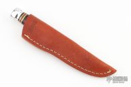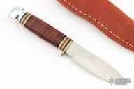 The knife has a satin finished blade with .210" blade stock and .957" blade depth, hidden tang construction. The handle has a brass guard, aluminum butt, stacked leather grip, black/brass/white/red spacers. Comes with brown leather sheath and original box and papers. Excellent condition.