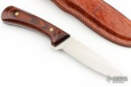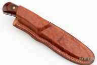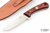 This knife by Western Cutlery features a satin finished blade with a full tang construction, .122" Blade Stock. 1.050" Blade Depth. The handle has wood scales with brass pins. Has some light scuffs and scratches, excellent condition otherwise. Comes with original brown leather sheath.