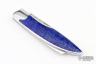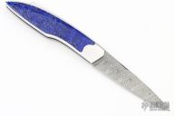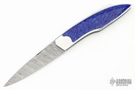 This knife by Saja Vincent features a Damascus drop point blade with a single nail nick. The handle a steel frame and backspring with lapis lazuli inlays. Includes a black leather slip sheath and a COA. New from maker!