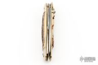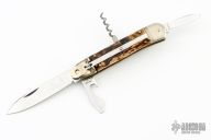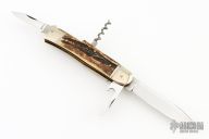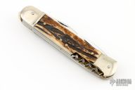 This Stag Multiblade Leverlock by Hubertus has a mirror polished blade, a mirror polished stainless steel clip point blade with nail nick, a mirror polished bottle opener/ flat head screwdriver, cork screw. Scales are stag antler over brass liners, stainless steel back spacer(s), and nickel silver bolsters. The action is stiff. Has a few light scratches, otherwise excellent condition.