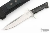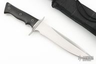 This Model 2 by Walter Brend features a double hollow ground blade with hand rub satin finish, and a 4" sharpened top edge, .240" blade stock and 1.619" blade depth, full tang construction. The handle has a satin finished titanium double guard, and black canvas micarta scales, hollow tube pins and lanyard hole. Comes with a black nylon sheath and a zippered case. This knife is beautiful and sports the "Walterboro, S.C." logo. Excellent condition. This one has a very thin guard and Walter said he only did about 20 like this. Comes with a letter about Walter and his life that he signed and dated 6/7/24 when this knife was shown to him. He said it was made about 2002.