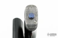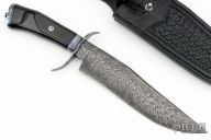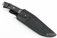 This "The Verdict" by Journeyman Smith Kelly Vermeer Vella features a Feather pattern Damascus blade with a false top edge, .192" blade stock and 1.767" blade depth, hidden tang construction. The handle has a hot blued forged steel guard, Damascus and fileworked blued steel spacers, beautiful water buffalo horn grip with a mosaic pin, Damascus butt with blued steel spacer and takedown screw. Comes with a hand tooled black leather sheath by Paul Long, and a zippered case. One of the very last Paul Long sheaths to ever be made. New from maker at the 2024 Blade Show.