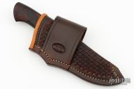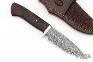 This Hunter by Journeyman Smith Charles Carpenter features a Damascus (1084/15N20) blade with .175" blade stock and 1.289" blade depth, hidden tang construction. The handle has a stainless steel guard and a Desert Ironwood grip with a single stainless steel pin. Comes with a hand tooled brown leather sheath and zippered case. New from maker at the 2024 Blade Show. Comes with COA.