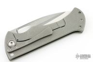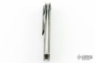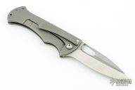This Tracker Dan Bloodshark by John Gray is a collaboration with Tracker Dan, it features a satin finished blade with thumbhole and fullers. The handle has a bark finished titanium frame with titanium pivot collars, and a tip down clip. Nice detent, lockup and blade seating. Comes with a zippered case. Has a couple light scuffs, otherwise excellent condition.