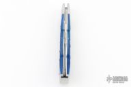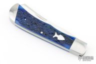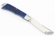 This slipjoint by Stanley Buzek features a hand rub satin finished blade with a nail nick. The handle has stainless steel bolsters and liners jeweled interiors, blue jigged bone covers, stainless steel escutcheon, stainless steel spring. Has half-stop, flush in all positions. Comes with a zippered case. New from maker at the 2024 Blade Show.