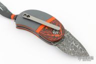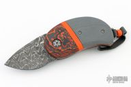 This Scale Release Model 18 Minnow features a Chad Nichols Damascus blade with swedge. The handle has dovetailed orange/black carbon scales with integral liners, orange G-10 inlay stripe and grey G-10 scales, stainless steel liners, Damascus backspacer, tip up titanium clip. Nice action, lockup and blade seating.  Includes a padded zippered case and COA. New from maker at the 2024 Blade Show.
