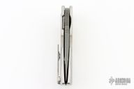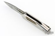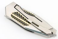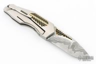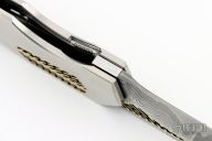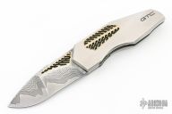 This Reduced Enigma by GTC features a GTC S35VN Core San Mai Damascus blade with milled brass inlays, notched thumbrest and Gus's proprietary flipper. The handle has a two-tone titanium frame with milled brass inlays, tip up titanium clip with milled brass inlays. Rides on bearings, nice detent, lockup and blade seating. This knife has a unique take down mechanism. Unscrew the clip to disassemble the knife. Check out his instagram to see how it works! Comes with zippered case and COA. Dated 2024. New from maker at the 2024 Blade Show.