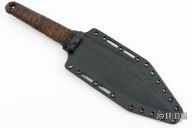 This knife by James Helm features a hand forged blade, .262" blade stock and 2.476" blade depth, hidden tang construction. The handle has a paracord/hemp wrap that has been epoxied. Comes with a kydex sheath set up for TekLok. New from Maker at Blade Show 2024.