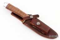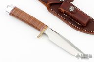 This Model 5-5 by Randall Made Knives features a satin finished blade with false top edge and notched thumbrest, .190" blade stock and 1.109" blade depth, hidden tang construction. The handle has a brass guard, stacked leather grip red/white/blue spacers, duralumin butt. Comes with a brown leather sheath and a Randall zippered case. Excellent condition.