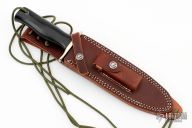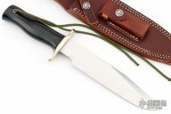 This Model 14 by Randall Made Knives features a satin finished blade with sharpened top edge, .191" blade stock, 1.394" blade depth, full tang construction. The handle has a nickel silver guard, black linen micarta handle with a lanyard hole at the butt. This knife was designed to meet the demand for an almost indestructible all-purpose knife, though it is especially suited for combat and survival purposes. Comes with brown leather sheath and a Randall zippered case. Excellent condition.