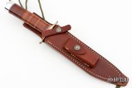 "The Model 1 by Randall Made Knives was made famous by Allied combat troops in World War II and has since been widely used in all theaters of war." This knife features a satin finished blade with a sharpened top edge, .183" blade stock and 1.278" blade depth, hidden tang construction. Brass guard, stacked leather handle with red/white/blue spacers, and a duralumin butt cap. Includes a brown leather sheath and a Randall zippered case. Has a little light spots of the blade, otherwise excellent condition.