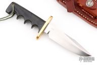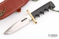 This is a miniature version of Randall's Model 14 Attack. The Model 14 was designed to meet the demand for an almost indestructible all-purpose knife, though it is especially suited for combat and survival purposes. #830. Satin finished blade with sharpened top edge, .177" blade stock and .833" blade depth, full tang construction. The handle has a brass guard and black linen micarta grip, lanyard hole at the butt. Knife is in excellent condition. Comes with original brown leather sheath. Comes with a Randall zippered case.