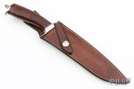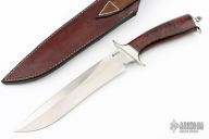 This fighter by Jim Siska features a hand rub satin finished recurve blade with sharpened top edge, .256" blade thickness and 1.350" blade depth, hidden tang construction. The handle has a mirror polished stainless steel guard and butt cap and a cocobolo grip with black/stainless steel spacers. Comes with original brown leather sheath dated '98. Excellent condition. Beautiful knife from a legend.