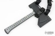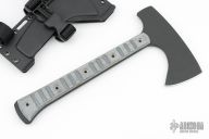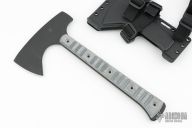 This MidTech Woodsman Tomahawk by James Helm features a Cerakote finish 3" blade and a hammer poll at the rear, .275" blade stock, full tang construction. The handle has Tero Tuf slabs and flared stainless tube rivets. Comes with a kydex sheath that has a buckle and strap. New from Maker!
