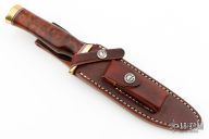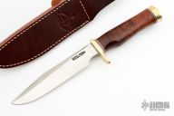 This Model 5 Camp and Trail Knife by Randall Made Knives features a satin finished blade with false top edge and notched thumbrest, .222" blade stock and 1.161" blade depth, hidden tang construction. The handle has a brass guard and butt with a desert ironwood burl grip with red/white/blue spacers. Comes with a brown leather sheath with belt loop. New from maker.