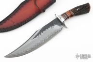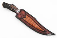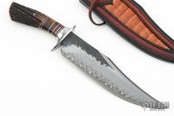 Another absolutely stunning piece from the Sobral brothers! This fighter features a San Mai Damascus blade with false top edge, .288" blade stock and 2.149" blade depth, hidden tang construction. The handle has a polished stainless steel guard and a beautiful stag grip with wood, stainless, and micarta spacers. This piece comes in an equally impressive, hand tooled, brown leather sheath and a leather zippered case. New from maker.