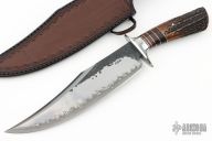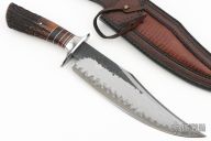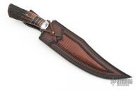 Another absolutely stunning piece from the Sobral brothers! This fighter features a San Mai Damascus blade with false top edge, .288" blade stock and 2.149" blade depth, hidden tang construction. The handle has a polished stainless steel guard and a beautiful stag grip with wood, stainless, and micarta spacers. This piece comes in an equally impressive, hand tooled, brown leather sheath and a leather zippered case. New from maker.