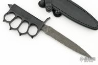 This Trench Dagger by Les George features a Damascus double edged blade with .195" blade stock, 1" blade depth, hidden tang construction. The handle has a cast brass knuckle guard grip with black cerakote finish and a skull crusher. Comes with a black leather scabbard by Chattanooga Leatherworks. Comes with a zippered case. New from maker at the 2024 Blade Show.