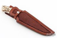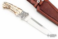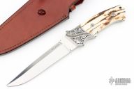 This Fighter by W.E. Ankrom features a hand rubbed, satin finished blade with nearly sharpened top edge, .189" blade stock and 1.187" blade depth, full tapered tang construction. The handle has engraved stainless steel bolsters with 24kt gold inlays, mammoth ivory scales with black liners and engraved stainless steel pins with 24kt gold inlays. Engraved by Julie Warenski. Comes with a hand tooled brown leather sheath with Paul Long. Comes with a zippered case. Excellent condition.