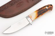 This Nesmuck Hunter by Jim Martindale features a mirror polished blade with false top edge, .167" blade stock and 1.062" blade depth, full tapered tang construction. The handle has a mirror polished stainless steel guard, amber stag scales with red liners/spacers, lanyard hole at the butt. Comes with a hand tooled brown leather sheath. New from maker at the 2024 Blade Show. #212 on the blade. Comes with COA