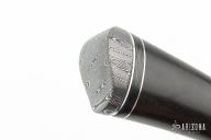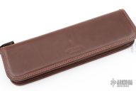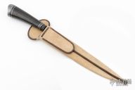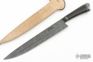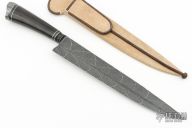 This knife by Mauricio C Daletzky features a Dragonfly Damascus (1070 and 15n20) blade with false top edge and an integral fluted guard, .221" blade stock and 1.502" blade depth, hidden tang construction. The handle has a fluted Damascus butt, stabilized Gabon Ebony wood grip with silver and carbon fiber spacers. Comes with a brown leather sheath, leather zippered case. New from maker at the 2024 Blade Show!