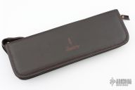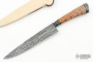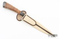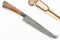 This knife by Mauricio C Daletzky features a River of Snakes pattern Damascus (1070 and 15n20) blade with false top edge and an integral fluted guard, .180" blade stock and 1.292" blade depth, hidden tang construction with a Damascus butt, stabilized Karelian Birch wood grip with nickel silver and brass infused carbon fiber spacers. Comes with a brown leather sheath, leather zippered case. New from maker at the 2024 Blade Show!