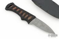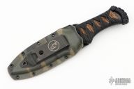 This Blood Shark by Tracker Dan features a drop point blade with .154" blade stock and 1" blade depth. The handle has a black cord wrap over hemp under wrap. Comes with a 3/4 kydex sheath and the knife will fit in either direction. Alsoc includes a red burlap bag and maker's card. New from maker at the 2024 Blade Show.