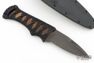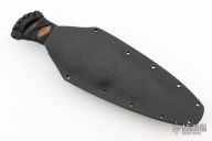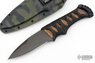 This Blood Shark by Tracker Dan features a drop point blade with sharpened top edge, .215" blade stock and 1" blade depth. The handle has a black cord wrap over hemp under wrap. Comes with a 3/4 kydex sheath and the knife will fit in either direction. Also includes a red burlap bag and maker's card. New from maker at the 2024 Blade Show.