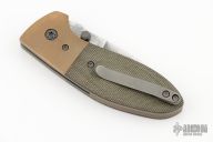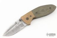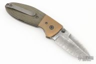 This Tom Krein Alpha linerlock features a Nichols Stainless Steel Boomerang Damascus pattern blade with dual titanium thumbstuds. The handle features bronze phosphorus bolsters, green canvas micarta scales, and acid/tumble finished liners. Pocket clip has a distressed finish to match the hardware/liners. Clip is positioned for tip up carry. Great blade seating, detent and lock up. Knife is new from Mr. Krein at the 2024 Blade Show and comes with the certificate of authenticity and Burnley case.