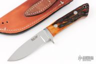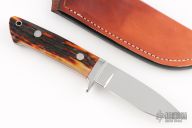 This Hunter by Charles Vestal features a mirror polished blade with .164" blade stock and 1.024" blade depth, full tapered tang construction. The handle is comprised of a mirror polished stainless steel guard and amber stag scales over red fiber liners, lanyard tube in pommel. Includes leather sheath with belt loop and a zippered case and COA. New from maker at the 2024 Blade Show. Charles' Loveless pattern knives are beautiful and as nice as they come.