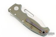 This AD20 by Andrew Demko features a hand ground hollow satin finished blade with notched thumbrest, thumbhole and dual thumbstuds.  The handle has an anodized titanium frame with a tip up anodized titanium clip and "Shark" lock release on the spine. Comes with original box and zippered case. MagnaCut Blade. New from maker at the 2024 Bladeshow.