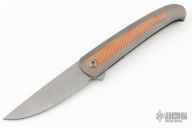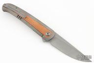 This Trenchant flipper by Richard Rogers features a bead blasted blade with notched flipper. The handle has a tumbled titanium frame with matching backspacer and tip up clip with hidden screws. Golfball textured copper inlays in the handle. Nice detent, lockup and blade seating. Comes with original case and COA dated Blade 2024. New from maker at the 2024 Blade Show.