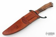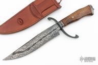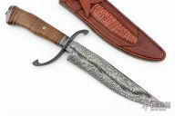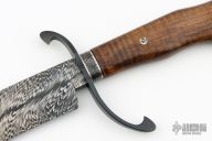 This "Storm Trooper" by Journeyman Smith Kelly Vermeer Vella features a "Flying W's" pattern Damascus blade with a false top edge, .200" blade stock and 1.575" blade depth, hidden tang construction. The handle has a hot blued forged steel guard, Damascus and fileworked titanium spacers, beautiful curly Koa wood grip with a mosaic pin, Damascus butt with fileworked titanium spacer, blued steel takedown screw. Comes with a hand tooled brown leather sheath with alligator inlay by Scott Gallagher, and a zippered case. New from maker at the 2024 Blade Show.