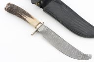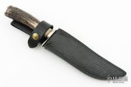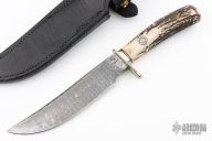 This Fighter by Charles Ochs features a Damascus blade with false top edge, .203" blade stock and 1.331" blade depth, hidden tang construction. The handle has a nickel silver guard, stag grip with a nickel silver butt, black/brass spacers. Comes with a black leather sheath with lizard skin overlay. Excellent condition.