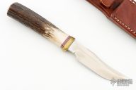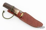This knife has a satin finished blade with sharpened top edge, .161" blade stock and .942" blade depth, hidden tang construction. The handle has a reduced brass hilt with red, white and blue spacers and a stag grip with compass in the butt. Comes with a brown leather sheath. Excellent condition.