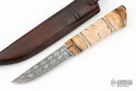 This Big Mammoth by carlMichael features a Konstantin Lysenko Mosaic Multi-Bar Damascus blade with .174" blade stock and 1.099" blade depth, hidden tang construction. The handle has a fluted mammoth ivory grip with black/nickel silver spacers. Comes with a brown leather sheath with mammoth ivory inlay. New from maker at the 2024 Blade Show.
