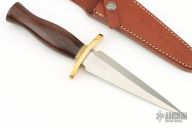 This Model 13-6C Arkansas Toothpick by Randall Made Knives features a satin finished double edged blade, .192" blade stock and 1.439" blade depth, hidden tang construction. The handle has a forward curved brass guard, desert ironwood burl grip with a black spacer, brass scalloped butt. The Model 13 is a replica of the historic stiletto-dagger famous in Confederate days. Comes with a brown leather sheath. Excellent condition.
