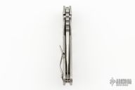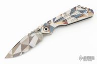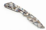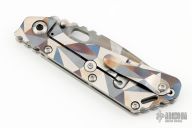 This Mick Strider Performance Series SMF framelock folder features an Antique Battleship Camo blade with thumbhole and notched thumbrest. The handle has an Antique Battleship Camo titanium frame with titanium clip, tip up carry. Jimping on blade spine. Includes Hinderer "Lock Bar Stabilizer" for maximum reverse lock retention. Nice detent, lockup and blade seating. New from the 2024 Blade Show!