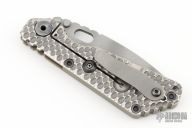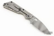 This SNG DGG by Strider has a tiger stripe spear point blade with dual thumb studs, thumb hole, and notched thumb rest. Handle is green G-10 and bead blasted titanium "Gunner Grip", lockbar stabilizer, and anodized titanium tip up clip. Nice detent, lockup and blade seating. Has a couple light scratches on the blade and clip. Great condition otherwise.