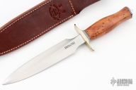 The Model 2-7 by Randall Made Knives is a heavily made dagger or dirk. Nickel silver guard, Thuya burl wood grip, duralumin butt cap, black/duralumin spacers. Double edged satin finished blade, .199" blade stock and 1.268" blade depth, hidden tang construction. Comes with a brown leather sheath. New from maker.