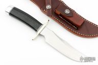 This model 4F by Randal Made Knives features a satin finished blade with a sharpened top edge, .204" blade stock and 1.371" blade stock, hidden tang construction. The handle has a nickel silver double guard and duralumin butt, black/duralumin spacers, and a black linen micarta grip. Comes with a brown leather sheath. New from maker.