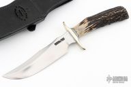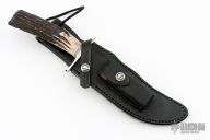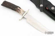 This model 4F by Randal Made Knives features a satin finished blade with a sharpened top edge, .212" blade stock and 1.358" blade stock, hidden tang construction. The handle has a nickel silver double guard and butt, black/duralumin spacers, and a stag grip. Comes with a black leather sheath. New from maker.