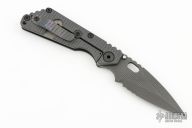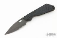 This Mick Strider SNG framelock folder features a laser engraved drop point blade with partial serrations, sharpened top edge, thumbhole and notched thumbrest. The handle has a black G-10 and flamed titanium frame with titanium clip, tip up carry. Jimping on blade spine. The G-10 has a cross-hatch pattern. Nice lockup, detent, and blade seating. Has a couple light scuffs on the frame, excellent condition otherwise. Signed in the finger choil.
