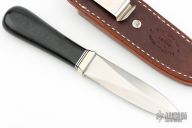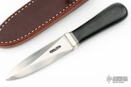 This Model 24 Guardian by Randall Made Knives features a satin finished double-edged blade with notched finger rests, .190" blade stock and .972" blade depth, hidden tang construction. Black linen micarta grip with red/white/blue spacers and a nickel silver guard. Both edges of the blade are sharpened with 1" of thumb notches. This model was designed in 1978 for use by police, undercover agents and law enforcement personnel for self-protection and as a back-up weapon. Comes with a brown leather sheath w/ boot clip. New from maker.
