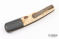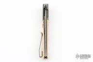 This Swayfront Persian Flipper by Brad Zinker features a Spirograph Damascus blade with checkered thumbrest and flipper. The handle has dovetailed Zirconium bolsters, mammoth ivory scales, anodized titanium liners with laser engraved interiors and a tip up anodized titanium clip. Rides on bearings, nice detent, lockup and blade seating. Comes with zippered case. New from maker at the 2024 Blade Show.