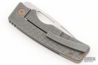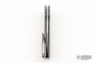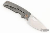 This knife by the OZ Machine Company features a tumbled Magnacut blade with thumbhole and notched thumbrest. The handle features a milled and tumbled titanium frame with a titanium backspacer and tip up clip with hidden screws. Includes box and papers dated 5-17-23 and s/n 1756.  Excellent Condition.