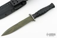 The M320 by Defiant 7 features a tiger stripe cerakote blade with false top edge and notched thumbrest, .185" blade stock and 1.125" blade depth, hidden tang construction. The handle has a stonewashed titanium guard with black G-10 grip. Comes with a black kydex sheath by Chattanooga Leather Works, and original box. New from maker at the 2024 Blade Show.